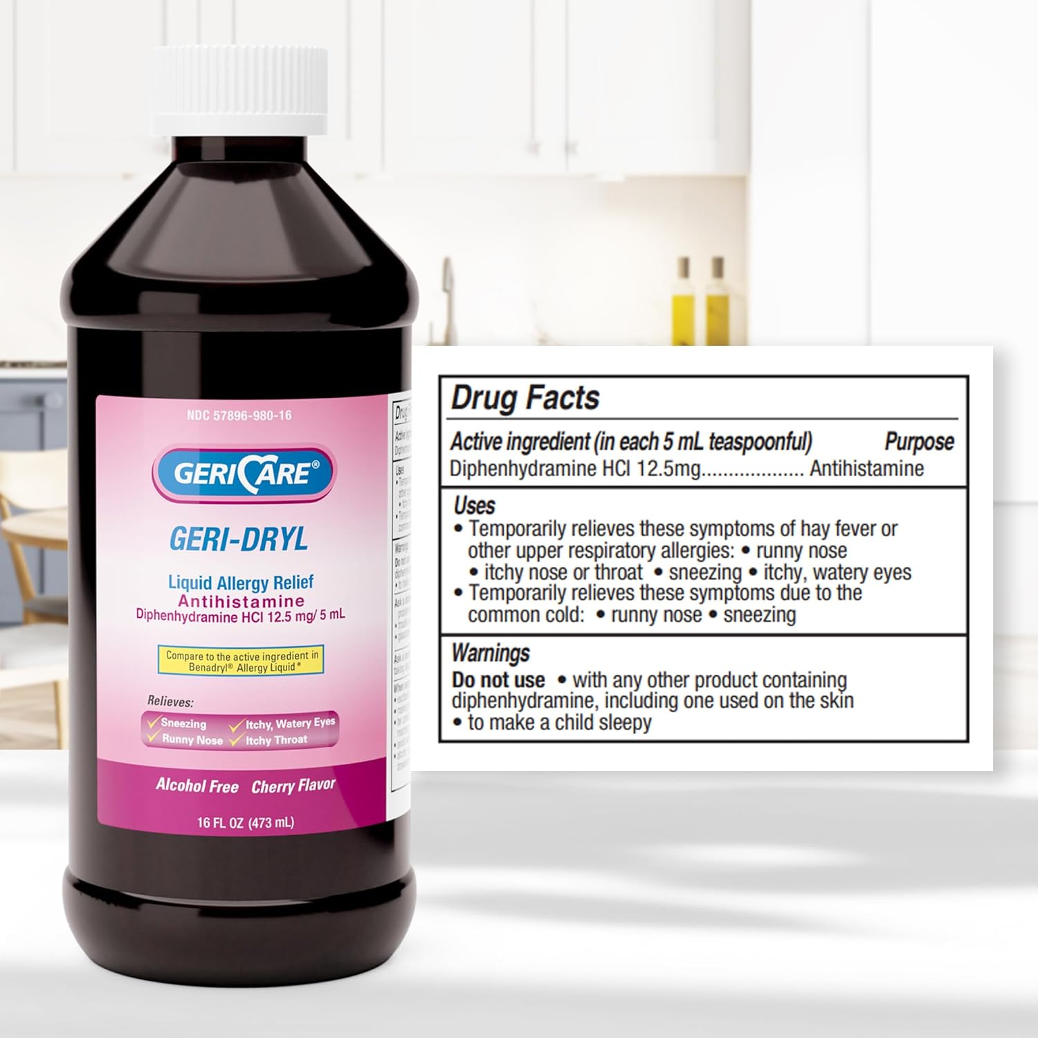GeriCare Geri-Dryl Diphenhydramine HCI Solution - Antihistamine Liquid Multi-Symptom Allergy Relief Formula - Relieves Sneezing Runny Nose, Watery, Itchy Eyes & Throat, 16 FL OZ